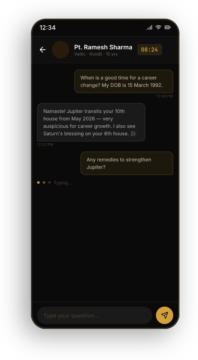 Get personalized predictions, remedies, and life guidance from experienced Vedic astrologers.
